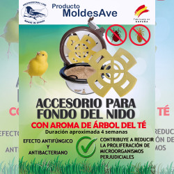 El Accesorio para Fondo de Nido de MoldesAve no solo mejora la higiene del nido, sino que también crea un entorno más saludable y cómodo para tus aves. Gracias a su aroma de Árbol del Té, disfrutarás de un ambiente agradable mientras mantienes a raya los microorganismos indeseados.